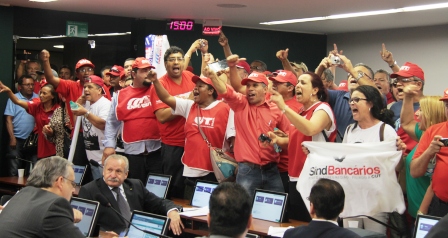 Pelo menos duas centenas de militantes e dirigentes de entidades sindicais da CUT ocuparam a Comissão de Constituição, Justiça e Cidadania (CCJ) da Câmara nesta quarta-feira (14) pela manhã para exigir o “arquivamento já” do PL 4330, o projeto da escravidão, que leva à precarização generalizada do trabalho, cuja votação foi adiada para setembro por pressão da Central. Os manifestantes romperam bloqueio na entrada aos CUTistas e desmascararam uma encenação de entidade patronal.