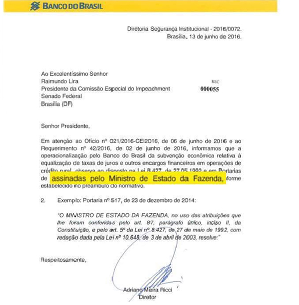 Em outro ofício à comissão do impeachment, o Banco do Brasil encaminha esclarecimentos da instituição financeira enviados ao Tribunal de Contas da União (TCU) que sustentam que as supostas pedaladas fiscais do Plano Safra não podem ser entendidas como um tipo vedado de empréstimo ao governo.