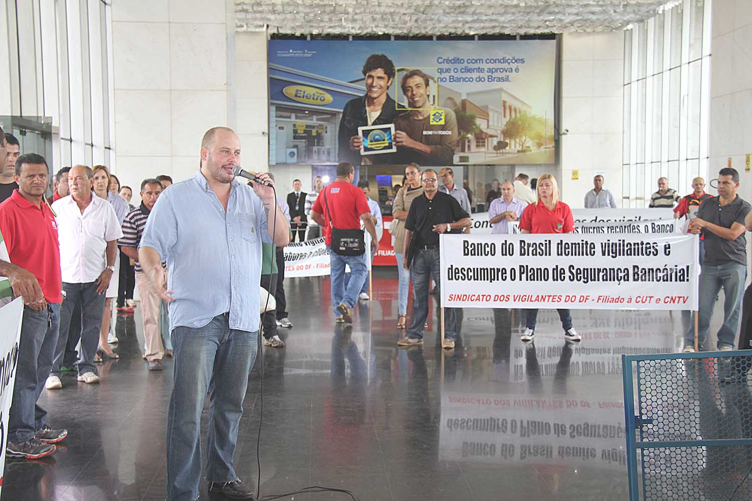 Bancários e vigilantes protestam no Sede III contra demissões no Banco do Brasil